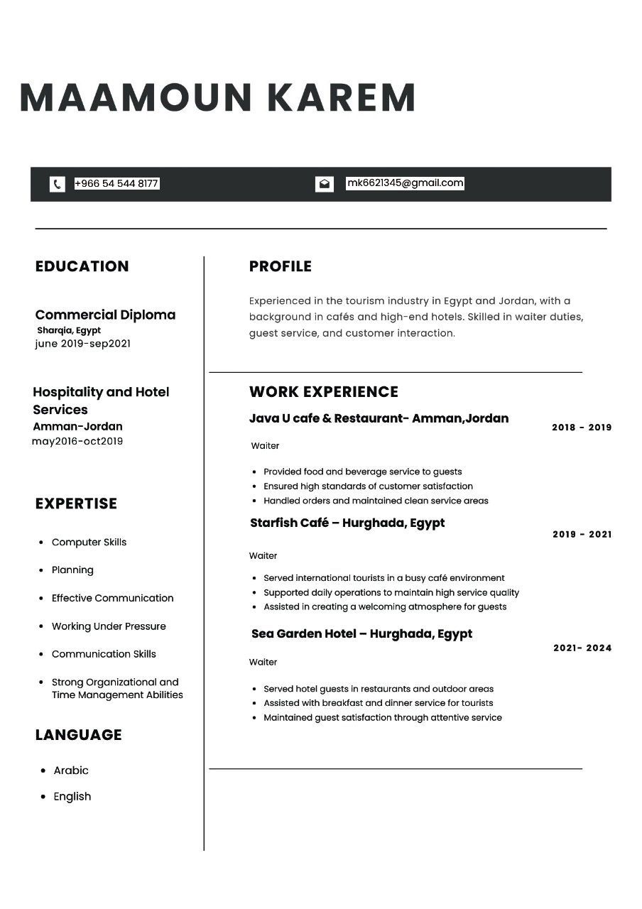 ابحث عمل أنا وايتر خبرة في مجال الكافيه والمطعم والفندقية