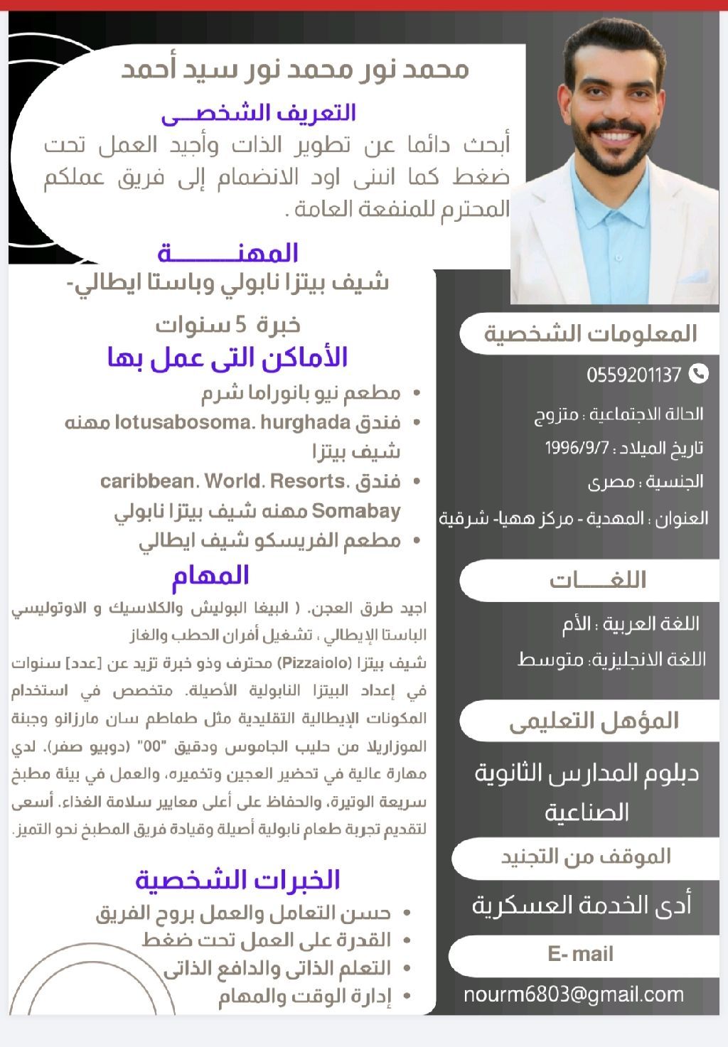 Professional Neapolitan Pizza and Italian Pasta Chef seeking a job. Skilled in preparing Biga, Poolish, Classic dough, and Autolyse. Currently based in Jeddah with valid residency, transferable sponsorship, and a health ce