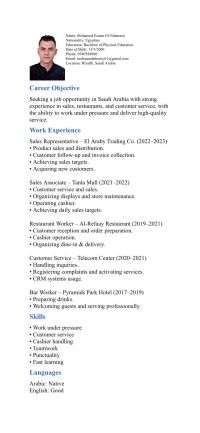 Egyptian resident in Saudi Arabia seeking a job in restaurants, malls, or cashier roles. Experienced in major hotels and restaurants in Egypt with strong customer service, order handling, cashier work, and organization. Able to work under pressure, reliable, and ready to start immediately with willingness to relocate within the Kingdom