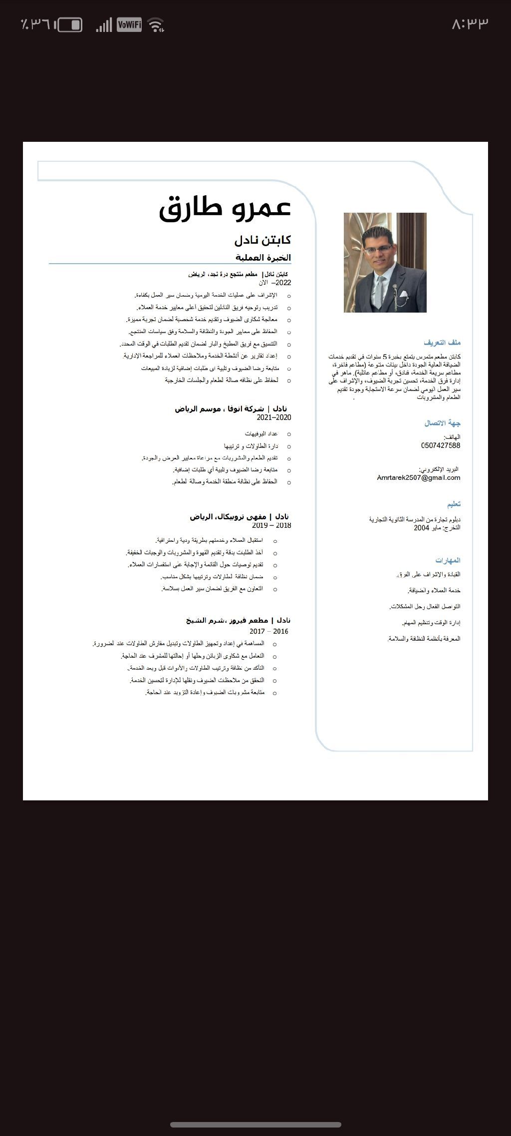 الاسم عمرو طارق عطوة إبراهيم منتجع درة نجد للترفيه لمدة 3 سنوات ونصف كابتن نادل لأخذ الطلبات وزيادة المبيعات تنظيم البوفيه
