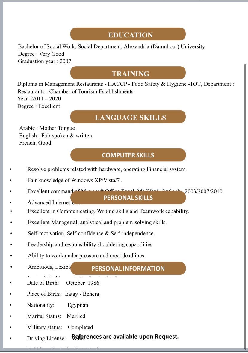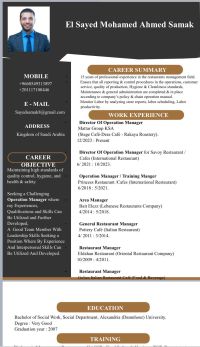 مدير تشغيل مطاعم وكافيهات. وعضو غرفة المنشاءات السياحية بوزارة السياحة. حاصل على دورات تدربية في تكاليف الأغذية والمشروبات. كورسات مثقلة بالخبرة في (الادارة - الضيافة - تخطيط وكتابة وهندسة قوائم الطعام - التكاليف - الهاسب - الموارد البشرية - المبيعات والتارجت. دراسة الجدوى للمطاعم - الإنشاءات - تكوين فريق العمل خبرة في التدريب - التسويق - الجودة. وضع الخطط والمتابعة - التقارير الشهريه