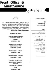 محترف في مجال الضيافة والسياحة والكافيهات بخبرة عملية في الاستقبال، خدمة العملاء، إدارة الصالة، وتنظيم العمل اليومي. امتلك مهارات عالية في التعامل مع الضيوف، حل المشكلات، والعمل تحت ضغط مع الحفاظ على جودة الخدمة ورضا العملاء. عملت في عدة مطاعم وكافيهات وتدرجت من خدمة العملاء الى الاشراف وقيادة الفرق، وأسعى دائما لتطوير الأداء وتحقيق أفضل تجربة للضيف بما يعكس صورة ايجابية للمكان