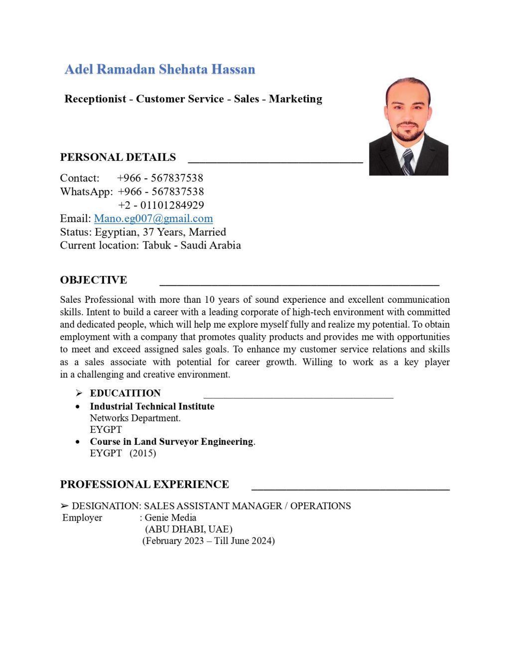 الاسم عادل رمضان شحاته العمر 38 سنة موظف استقبال اعمل في مجال الضيافة العامة والاستقبال لدي خبرة أكثر من 5 سنوات في مجال الاستقبال بالمملكة العربية السعودية ومجال الشقق الخدمية والمفروشه أجيد التعامل باللغة الانجليزية