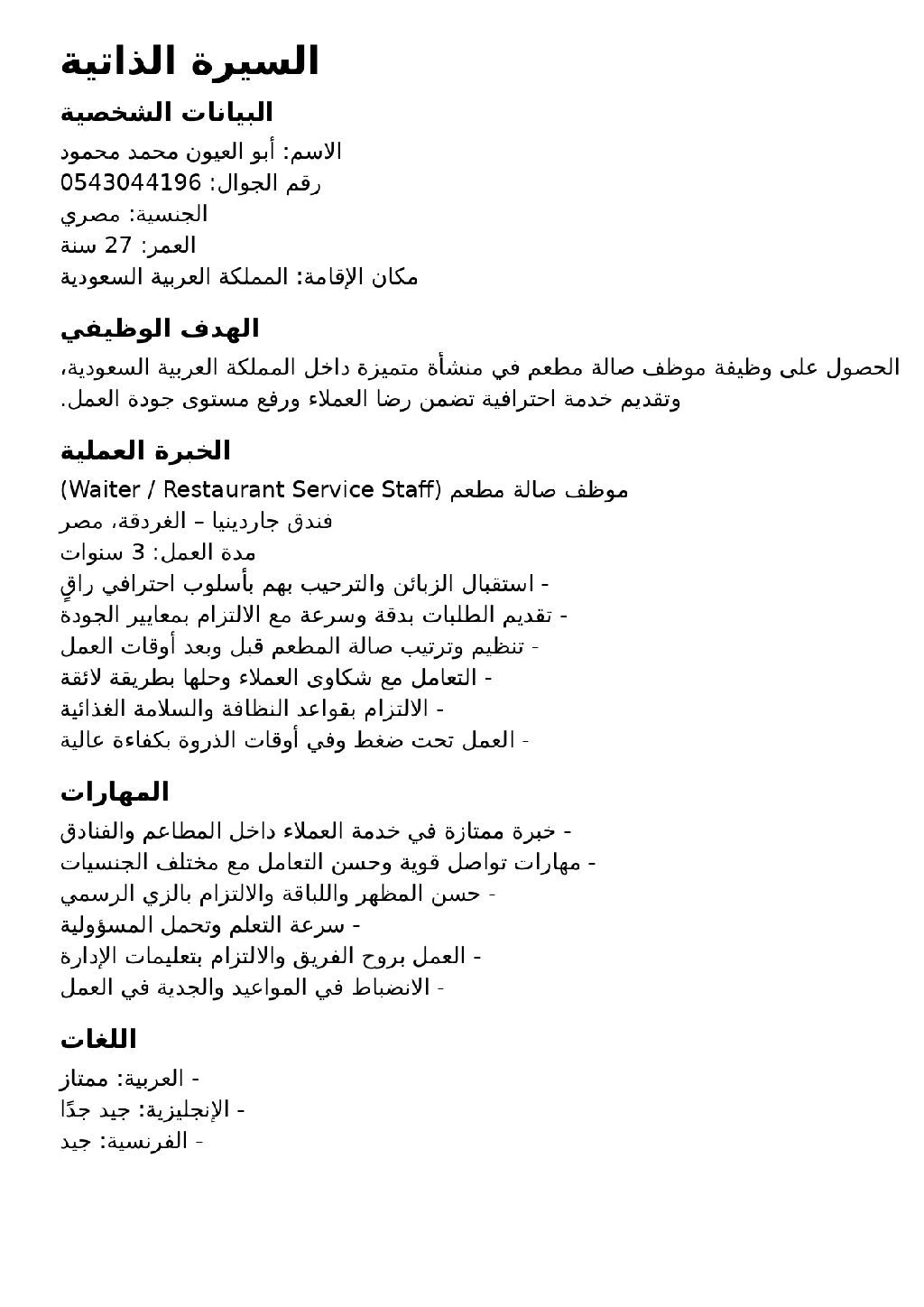 المؤهل الدراسي ليسانس آداب - لغة فرنسية اجادة اللغة الفرنسية تحدثا وكتابة خلفية قوية في اللغات والتواصل مع العملاء الخبرات العملية موظف صالة مطعم - فندق جاردينيا (الغردقة - مصر) مدة الخبرة 3 سنوات استقبال الضيوف والتعامل معهم بأسلوب راق واحترافي تقديم الطلبات بدقة والالتزام بمعايير الجودة العمل تحت ضغط وفي أوقات الذروة الالتزام بقواعد النظافة والسلامة الغذائية مسؤول حسابات ومبيعات - مخازن مواد