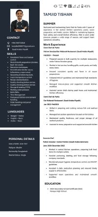 خبرة خمس سنوات كطاهي في مطعم فتوس نوبار اللبناني، قسم الأطباق الساخنة، الإفطار والغداء، وقسم الأطباق الباردة