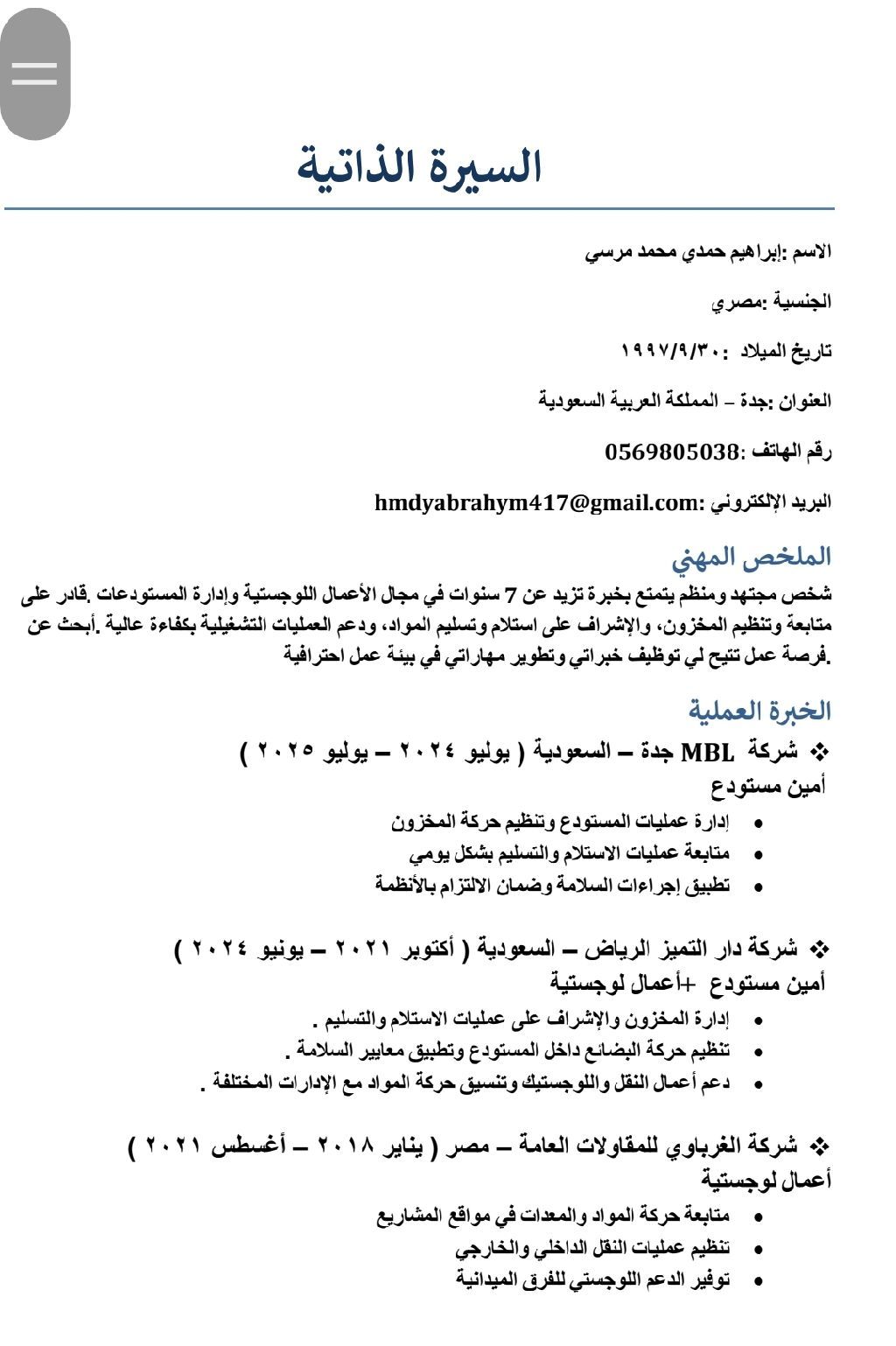 إبراهيم حمدي محمد موسي الجنسية مصري الملخص المهني شخص مجتهد ومنظم يتمتع بخبرة تزيد عن 4 سنوات في مجال األعمال اللوجستية وإدارة المستودعات. قادر على متابعة وتنظيم المخزون، واإلشراف على أستألم وتسليم المواد، ودعم العمليات التشغيلية بكفاءة عالية