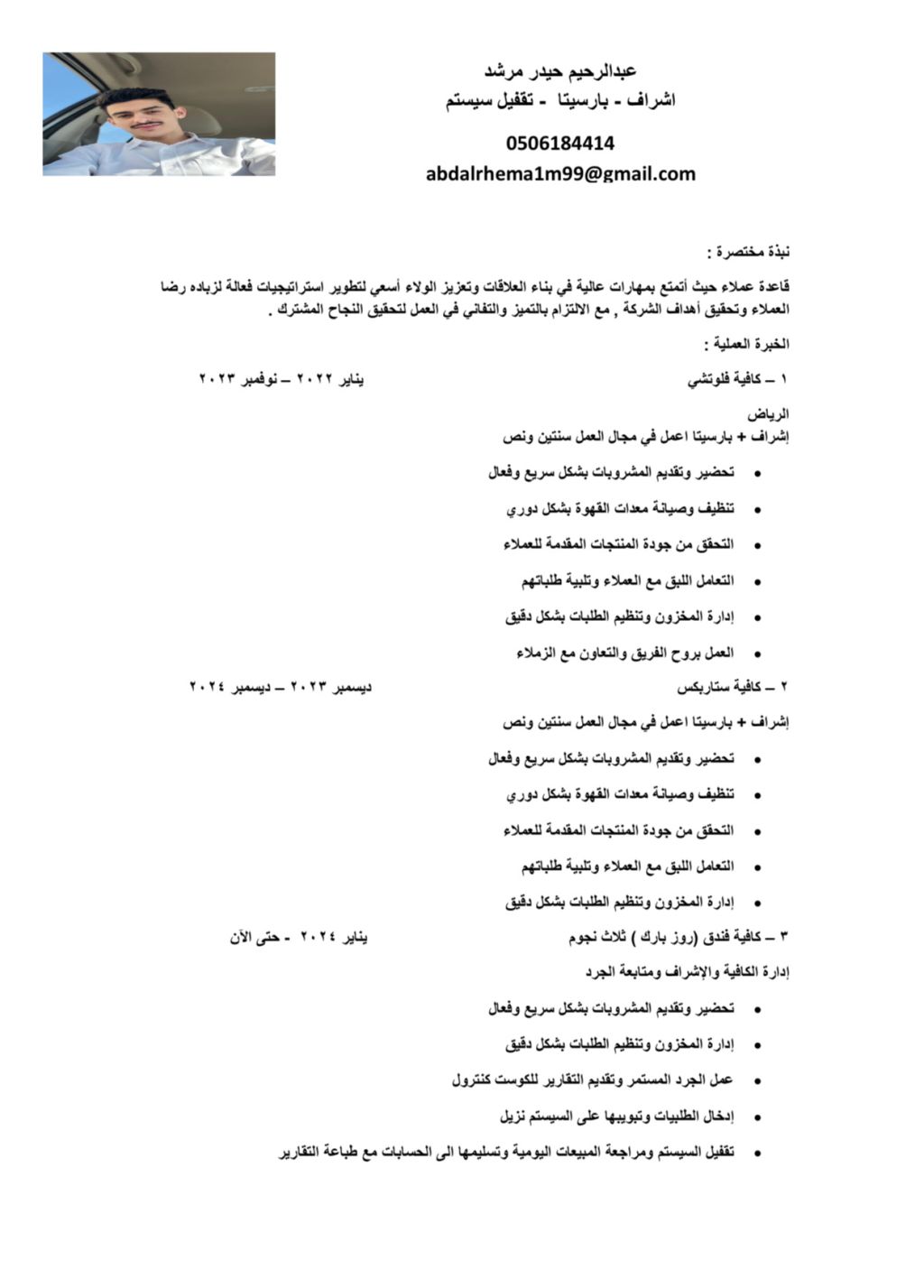 ابحث عن وظيفة باريستا خبرة في مجال العمل 4 سنوات عملت في ادارة كافية اشراف على فريق العمل تدريب عمال باقي الأشياء في السيرة الذاتية العمر 24