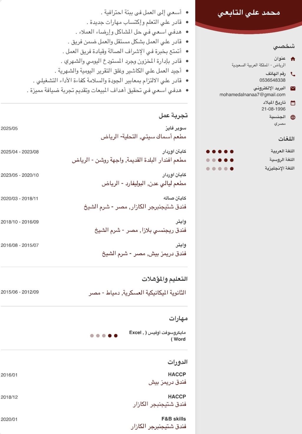 خبرة أكثر من 10 سنوات في الفنادق والمطاعم الراقية مسؤول عن كل شيء داخل التشغيل من نظافة وجوده وخدمة وأدارت مبيعات وخفض تكاليف وتقليل الهدر ورفع مستوى الخدمة والجرد وتدريب الاصطاف علي رفع نسبة المبيعات وعمل تقارير اليومية والشهرية