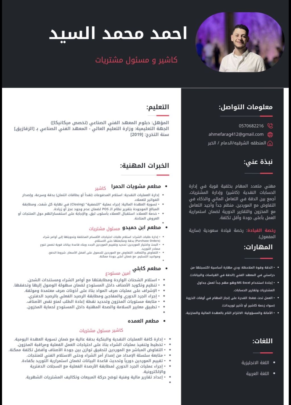 كاشير ومسؤول مشتريات مصري لدي رخصة قيادة موجود في الدمام ابحث عن عمل وليس لدي أي مانع في التنقل الى أي مكان في المملكة في حين توفر فرصة جيده