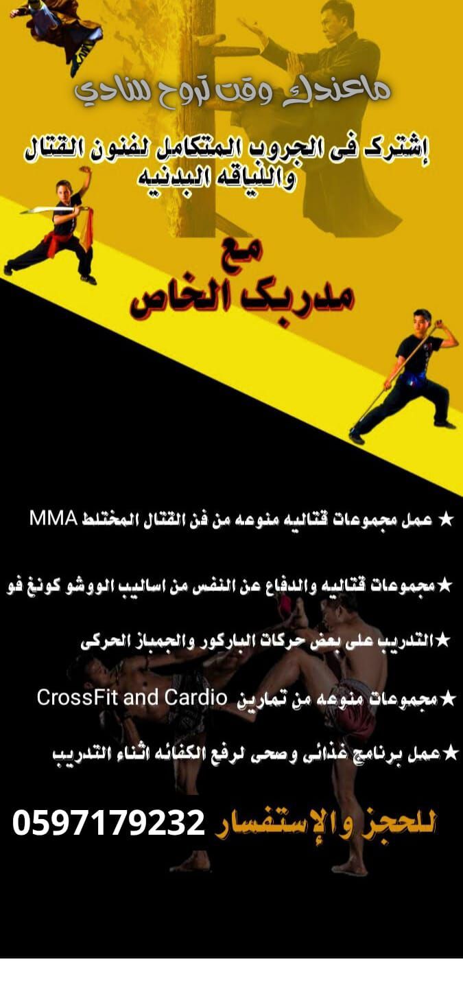 مدرب خاص للدفاع عن النفس واللياقة البدنية هل تبحث عن قوة حقيقية ثقة بالنفس جسم رياضي وقدرة فعلية على الدفاع عن نفسك أنا مدرب خاص متخصص في الدفاع عن النفس واللياقة البدنية، أقدم تدريبا عمليا وفعالا يناسب جميع المستويات أنواع التدريب كونغ فو (قوة - تركيز - سرعة رد الفعل) MMA (فنون قتالية مختلطة - قتال واقعي) كيك بوكس (لياقة عالية - حرق دهون - قوة ضربات)