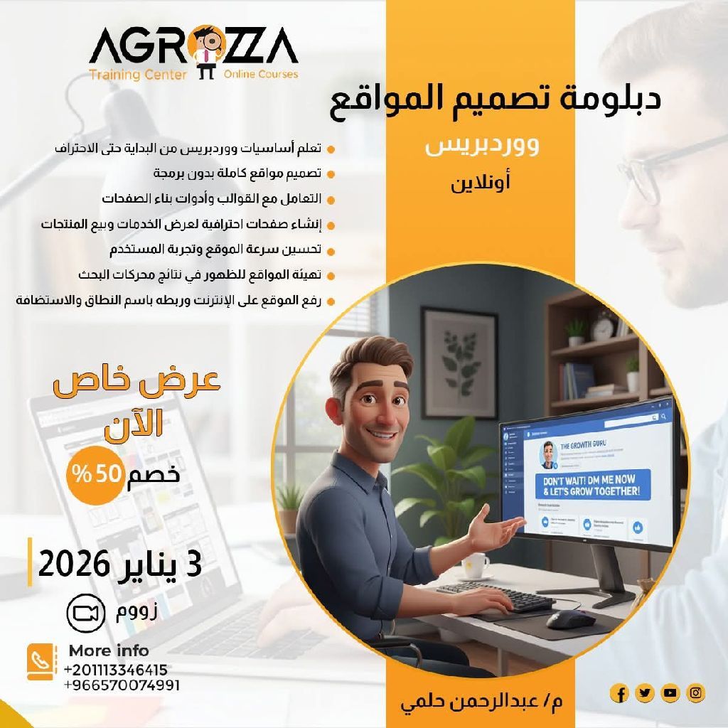 دبلومة في تصميم المواقع عن طريق الوورد بريس هتتعلم كيف تعمل علي تصميم المواقع والمتاجر الالكترونية وكيفية شراء الاستضافة والدومين وعمل ايميلات رسميه باسم الشركة وكتابة المحتوي وعمل تصاميم علي الثيمات الجاهزه وعمل تصميمات من الألف الى الياء وكيف تتعلم ادارة المتاجر الالكترونية وكيفية ادارة المواقع وتحديثها وعمل أمن علي الموقع وسرعة المواقع أو المتجر الالكتروني كل ده بسعر مغري جدا