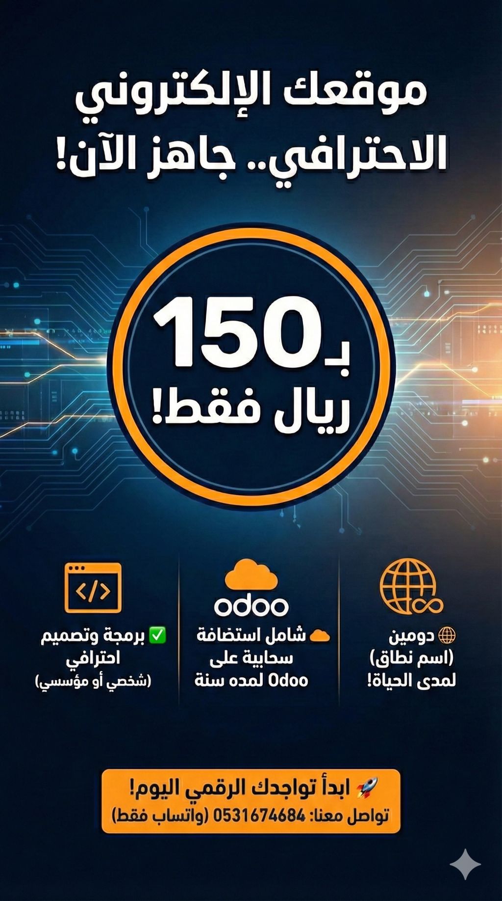فقط ب 150 ريال وامتلك موقعك الالكتروني بدومين خاص باسمك أو اسم مؤسستك صالح لمدى الحياة وباستضافة لمدة سنة كاملة من أودو مجانا وبعدها التجديد سنويا فقط 50 ريال لكل سنة عرض لن يتكرر