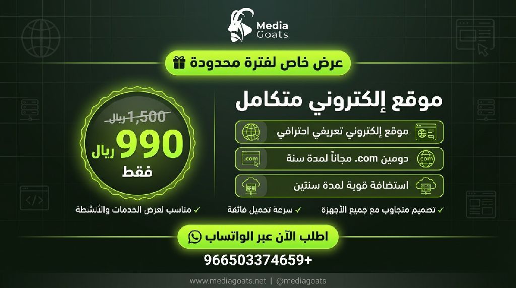 عرض خاص لفترة محدودة، موقع الكتروني احترافي متكامل لنشاطك أو خدمتك بسعر 990 ريال فقط. العرض يشمل تصميم جذاب متوافق مع الجوال + سرعة تحميل عالية + دومين. com مجاني سنة كاملة، واستضافة قوية لمدة سنتين. مناسب للاعلانات وتحويل الزوار لعملاء فعليين. جاهز للانطلاق فورا وبشكل يليق باسمك التجاري. تواصل معنا الآن لطلب الخدمة، عرض مؤقت