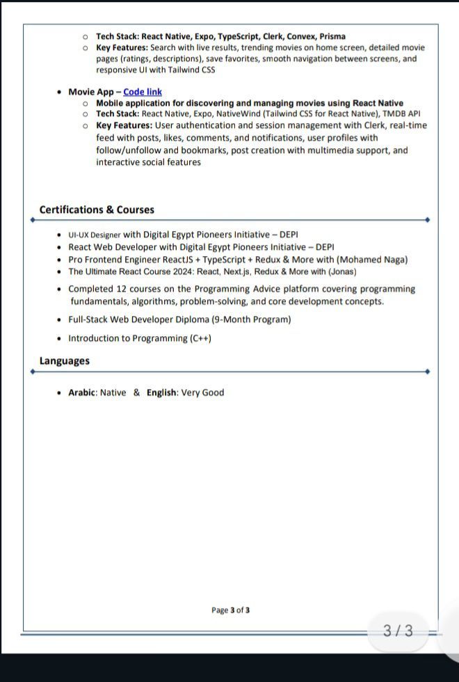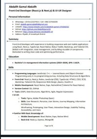 Frontend Developer بخيره سنة في السعودية قمت ببناء العديد من المواقع ك Dashboard, Portals, landing page, ومواقع اخرىأمتلك الكثير من المهارات المطلوبه في سوق العمل مثل React. js, Next. js, JavaScript, TypeScript, Bootstrap, Tailwind, Jquery, HTML 5، CSS3, ShadCN UI, Tanstack, وكثير من المكاتب الأخرى اللتي تسهل في انجاز المهام متفرغ وجاهز للعمل من الآن