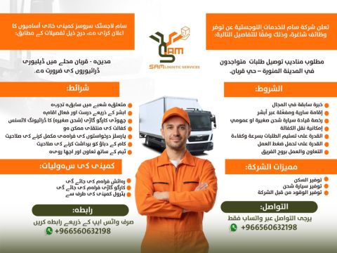 SAM Logistic Services Company SAM Logistic Services Company announces the availability of job vacancies according to the following details Delivery Representatives Required Applicants must be located in Madinah - Qurban District Requirements Previous experience in the field Valid and active residency (Iqama) through Absher Small cargo truck driving license Transfer of sponsorship is required Ability