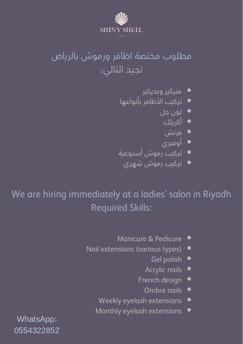 مطلوب للعمل في صالون نسائي مشهور متخصصه في الضوافر والبديكير والمنيكير ومطلوب متخصصه شعر من صبغة وقصات التواصل واتساب مع كتابة التخصص على الرقم