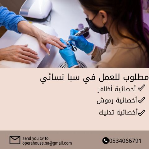 مطلوب للعمل في سبا نسائي جديد بحي السويدي، شارع عائشة بنت أبي بكر - أخصائية اظافر، أخصائية رموش، أخصائية تدليك (متوفر سكن ونقل والراتب حسب الخبرة)