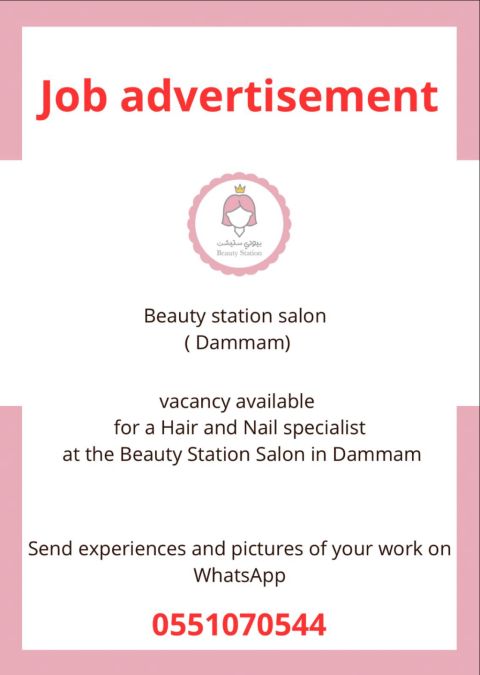 Job Opportunity A prestigious ladies’ beauty salon and spa in Khafji is pleased to announce job openings for experienced beauty specialists skilled in various salon services. Required Documents Curriculum Vitae (CV) Copies of training or experience certificates (if available) Application Process Interested candidates are invited to contact us via