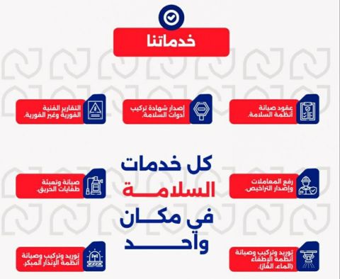 نحن شركة نعمل في مجال الأمن والسلامة، يضم فريقنا نخبة من المهندسين والفنيين ذوي الخبرة الواسعة الذين يلتزمون بتطبيق أعلى معايير الجودة والسلامة في مشاريعنا. خدماتنا توريد وتركيب وتسليم أنظمة الدفاع المدني، عقد صيانة أنظمة السلامة، رفع المعاملات واصدار التراخيص، الأنظمة الأمنية، التقارير الفنية الفورية وغير الفورية