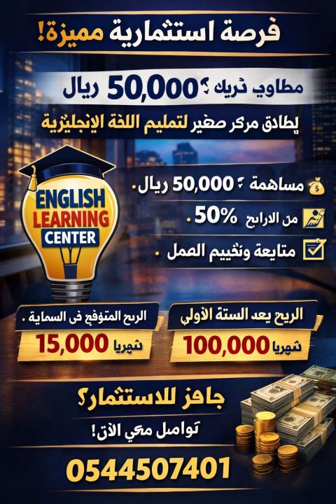 فرصة استثمارية في مركز لتعليم اللغة الانجليزية ابحث عن شريك مستثمر بمبلغ 50000 ريال لاطلاق مركز صغير لتعليم الانجليزية في جدة. مقابل 50% من الأرباح. نموذج الربح المتوقع متوسط سعر الدورة 500 ريال عدد الطلاب المتوقع 30 طالب شهريا الإيراد المتوقع 15000 ريال شهريا في البداية مع التوسع والتسويق يمكن الوصول الى 80000 - 100000 ريال شهريا خلال السنة الأولى. المطلوب من الشريك التمويل في