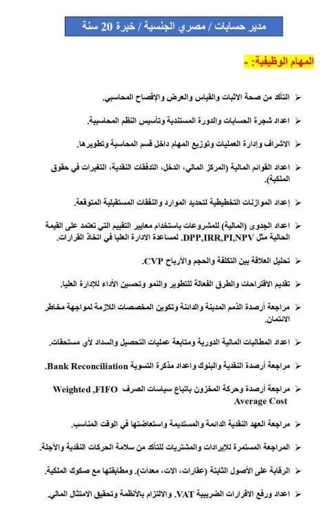 مدير حسابات خبرة 20 سنة مقيم في جدة ابحث عن وظيفة في جدة ومكة التأكد من صحة الاثبات والقياس والعرض والإفصاح المحاسبي اعداد القوائم المالية الدورية والسنويه مراجعة أرصدة الذمم المدينة والدائنة بالاضافة الى تكوين المخصصات اللازمة لمواجهة مخاطر الائتمان مراجعة أرصدة النقدية بالصندوق ولدى البنوك وعمل مذكرة التسوية الاشراف والرقابة على الأصول الثابتة من عقارات وآلات ومعدات