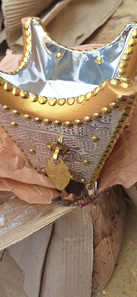 مبخرة حائليه تقليدية مصنوعة يدويا. مصنوعة من خشب الأثل الأصلي ومغطاة بصفائح معدنية منقوشة باللون الفضي ومطعمة بمسامير نحاسية ذهبية. تتميز بتصميم فريد يعكس التراث السعودي الأصيل. تستخدم لتب خير العود والعطور في المناسبات والاحتفالات الاجتماعية. تساعد في تنقية الهواء من الروائح وتضفي جوا من الاسترخاء