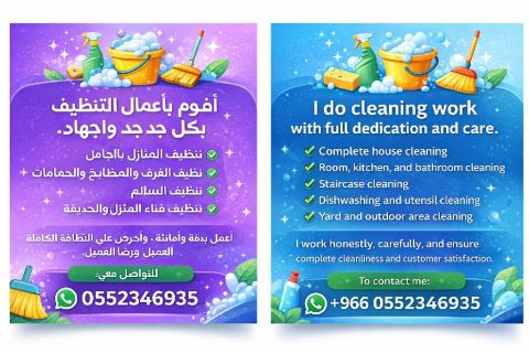 I do cleaning work with full dedication and care. Complete house cleaning Room, kitchen, and bathroom cleaning Staircase cleaning Dishwashing and utensil cleaning Yard and outdoor area cleaning I work honestly, carefully, and ensure complete cleanliness and customer satisfaction. To contact me
