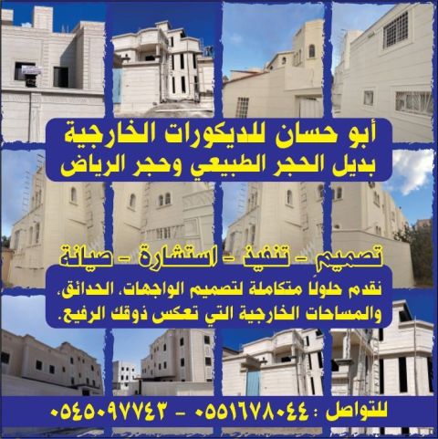 الاستعداد التام لتوريد وتركيب الحجر والرخام مع عمل التصميم وتنظيف واجهات الحجر وترميم أعمال الحجر خبرة عشرين سنة حجر الرياض والأردني وبأيدي فنية خبيرة واستعداد للاشراف على أعمال الترميم والتشطيبات داخلي وخارجي المودرن وعندنا خدمة التصميم الداخلي والخارجي والتنفيذ والاشراف وتنفيذ الكافيهات والمطاعم والمشاغل باحترافية وعملاؤنا تشهد لنا