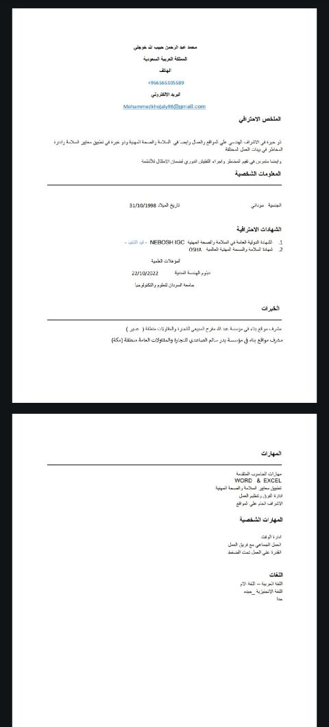 سوداني الجنسية ابحث عن وظيفة كمشرف مقاولات أو كموظف أمن وسلامة حاصل علي شهادة أل OSHA واعمل علي شهادة أل NEBOH IGC قريبا بإذن الله بتتوفر الشهادة رخصة سارية وإقامة سارية قابلة للنقل