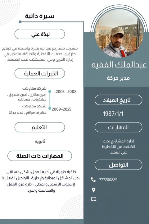 الاسم عبد الملك الفقيه السن 37 الوصف الوظيفي الاشراف المباشر على تنفيذ أعمال التشطيب في المواقع الانشائية وضمان جودة التنفيذ وفق المخططات والتصاميم المعتمدة. الاشراف المباشر على أعمال الردم والطرق والمقاولات والبنية التحتية خبرة أكثر من 18 سنة إقامة سارية ورخصة سارية