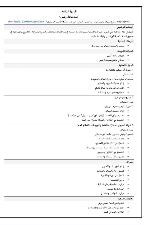 مشرف كهرباء (elect. supervisor) خبرة لأكثر من 9 سنوات في مجال الإنشاءات والمقاولات بالسوق السعودي، نفذت مشاريع صناعية وسكنية وادارية وتعليمية وطبية ومعارض ومركز فحص. حاصل على شهادات HSE من ارامكو. وقادر على قيادة فرق من الفنيين وتوجيههم وتطوير أداءهم للوصول لأعلى جودة عمل، أجيد رسم الاوتوكاد ولدى رخصة قيادة وإقامة سارية وعضوية في أل SCE سارية، لمزيد من التفاصيل تواصل على واتساب لتحصل على نسخة CV