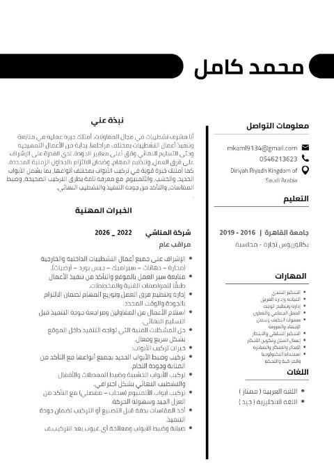 أنا مشرف تشطيبات لدي خبرة عملية في مجال المقاولات، ابحث عن فرصة عمل مناسبة. لدي خبرة في الاشراف على جميع أعمال التشطيبات الداخلية والخارجية، ومتابعة التنفيذ بالموقع وفق المخططات والمواصفات الفنية، مع القدرة على إدارة فرق العمل وضمان جودة التنفيذ والالتزام بالمواعيد. كما امتلك خبرة في تركيب الأبواب بجميع أنواعها (حديد - خشب - ألومينيوم) من حيث ضبط المقاسات، والتركيب الصحيح