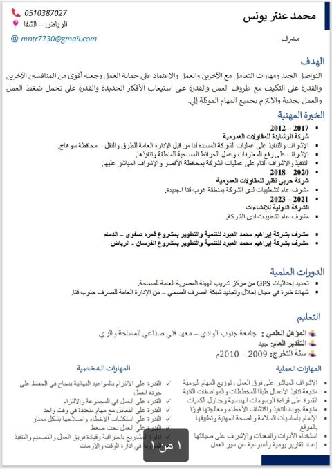 مختص موارد بشرية خبرة ثمان سنوات على النظام المحاسبي أونكس برو والعمل على منصة ابشر وقوى والتأمينات وحماية الأجور ويوجد رخصة قيادة سارية وحاصل على شهادة الرخصة الدولية لقيادة الحاسوب جامعة كمبردج (عن بعد) ودبلوم عالى سنتان تسويق