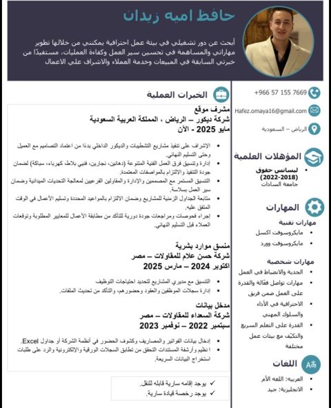 My name is Mahmoud Mohsen Mohamed Bahaa El - Din, I am 25 years old, hold a Bachelor's degree in commerce, am Egyptian, and reside in Riyadh. I am seeking employment in the following fields Accountant - Banking - Data Entry - Administration - Human Resources) I have over two and a half years of experience as an accountant In Egypt, I have experience in the medical and restaurant sectors, working