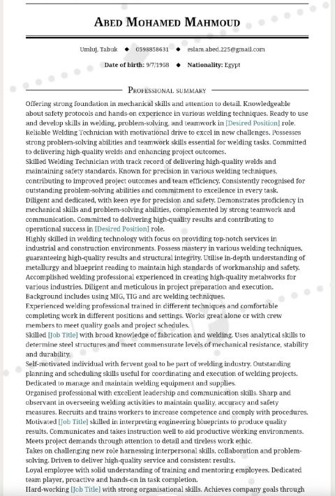 Professional Welding Technician with extensive experience in various welding techniques, including MIG, TIG, and Arc Welding. Highly skilled in interpreting engineering blueprints and understanding metallurgical properties to ensure the highest standards of structural integrity and safety. Proven ability to operate in complex Industrial and construction environments, with a demonstrated track re