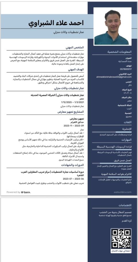 بنا مصري الجنسية لديه خبرة تتجاوز على 10 سنوات في جميع أنواع المباني وجميع أنواع الديكورات المنزلية وتصميم مجالس عربي وبالأخص مجالس السعودي ولديه الخبرة في العمل في أفران خبز السعودية