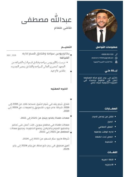 أنا شاب سوري الجنسية، لدي خبرة كبيرة في بيع الحلويات الشرقية والغربية داخل المملكة. عملت في أسماء مميزة مثل (سنع بناتنا) وبلح وعسل) وتخصصت في تقديم تجربة شراء ممتعة للزبون. أعرف كيف أشرح للزبون الفرق بين الأصناف وأقنعه بالأفضل. مهتم جدا بنظافة وترتيب المعرض. مرونة عالية في العمل تحت ضغط الزحام. يسعدني الانضمام لفريق عملكم المميز