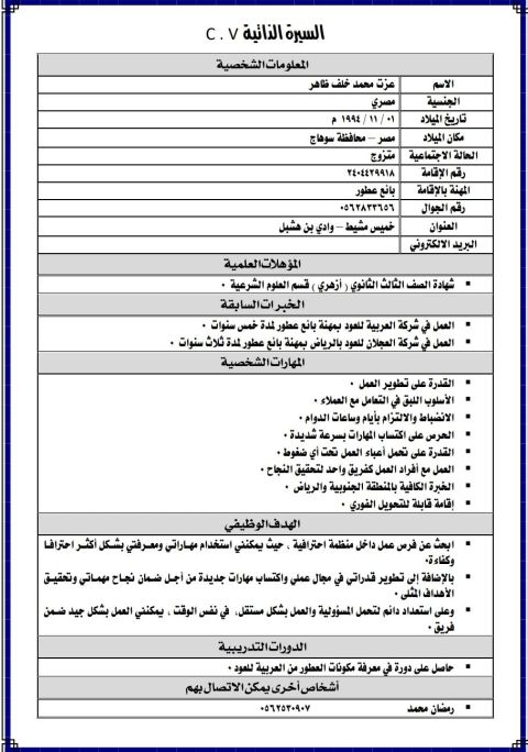 الاسم محمد الهمام الإقامة سارية في المملكة العربية السعودية ابحث عن فرصة عمل في الأسواق أو المطاعم، حيث أتمتع بالجدية والانضباط وحب العمل الجماعي وخدمة العملاء. أحرص دائما على أداء المهام باتقان وسرعة، وأسعى لتطوير مهاراتي وخدمة المكان الذي اعمل فيه بأفضل صورة ممكنة. جاهز للعمل فورا