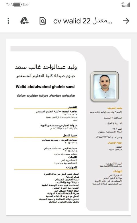 أنا وليد عبدالواحد مساعد صيدلي عملت في صيدلية مساعد صيدلي صارف ادوية مدخل ادوية في النظام المحاسبي ومراقب صلاحيتها يمكنني استخدام الكمبيوتر ويمكنني التعلم سريع على أنظمة المبيعات