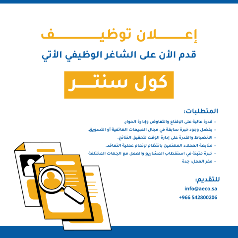 تعلن شركة AECO عن توفر فرصة وظيفية بمسمى (كول سنتر) لمن تجد في نفسها الكفاءة والقدرة على الاقناع، للانضمام الى فريقنا في مدينة جدة - حي الربوة - شارع الأمير ماجد. المتطلبات الوظيفية قدرة عالية على الاقناع والتفاوض وإدارة الحوار الاحترافي. يفضل وجود خبرة سابقة في مجال المبيعات الهاتفية أو التسويق. الانضباط التام والقدرة على إدارة الوقت لتحقيق النتائج المستهدفة. متابعة العملاء المهتمين بانتظام لاتمام