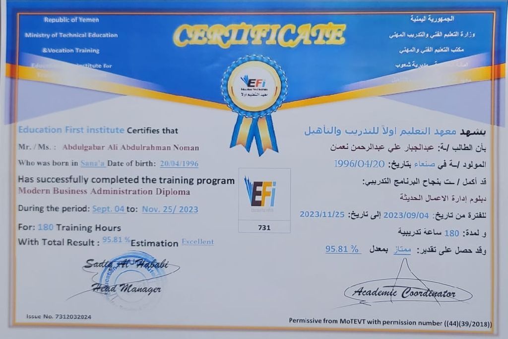 حائز على شهادة فني تكييف تبريد وحائز على شهادة isdl الحاسوب والأوفيس وحائز على شهادة ريادة العامل والتسويق
