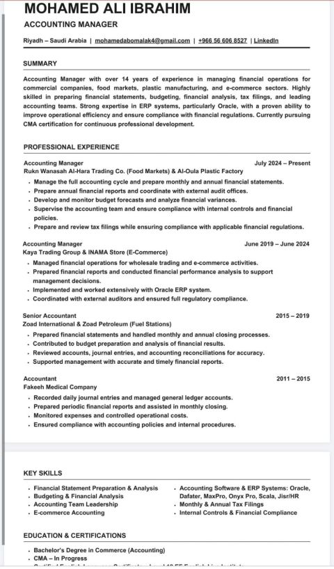 محاسب مالي واداري سوداني بخبرة تزيد عن 5 سنوات داخل السعودية، متمكن من الأعمال المحاسبية والادارية، واعداد المراسلات الرسمية، مع مهارات حاسوبية عالية وخبرة في البرامج المحاسبية والمنصات الحكومية (قوى، مدد، تم، هيئة النقل، الزكاة والضريبة، اعتماد)