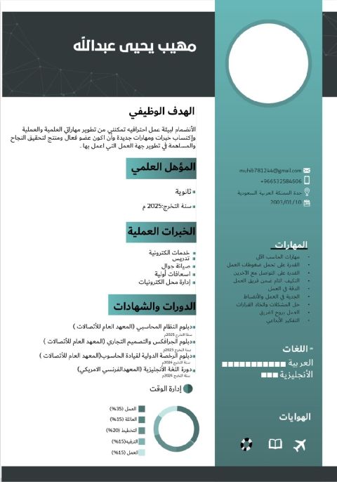 أتقدم بطلبي للحصول على فرصة عمل بوظيفة محاسب حديث التخرج، حيث امتلك المهارات الأساسية المحاسبية والقدرة على استخدام الكمبيوتر وبرامج الأوفيس بكفاءة. المؤهلات والمهارات بكالوريوس محاسبة (حديث تخرج) اجادة استخدام الكمبيوتر. مهارة عالية في برامج Excel وWord. معرفة جيدة بالقيود المحاسبية والمصطلحات المالية. سرعة في التعلم وقدرة على العمل ضمن فريق. دقة في ادخال البيانات وتنظيم المستندات