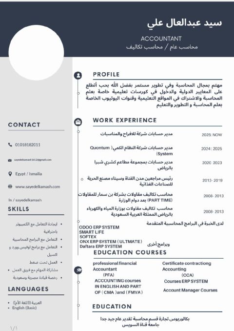 محاسب تكاليف ومراجع مالي واداري ومدير مخازن وخبرة 18 عام خبرة في مراجعة التسويات الماليه وتحليلها ومراجعة المستخلصات وسرا كي العمالة وأوامر الشراء وخبرة سابقه في العلاقات العامة وتأسيس الشركات تم العمل في قطر والامارات ومصر والآن السعودية علي دراية تمامة باظهار معدلات الانحرافات لدي الانتاج والخامات والمبيعات وأيضا خبرة في مجال التسويق العقاري أون لاين وخبرة في اعلانات السوشيال ميديا