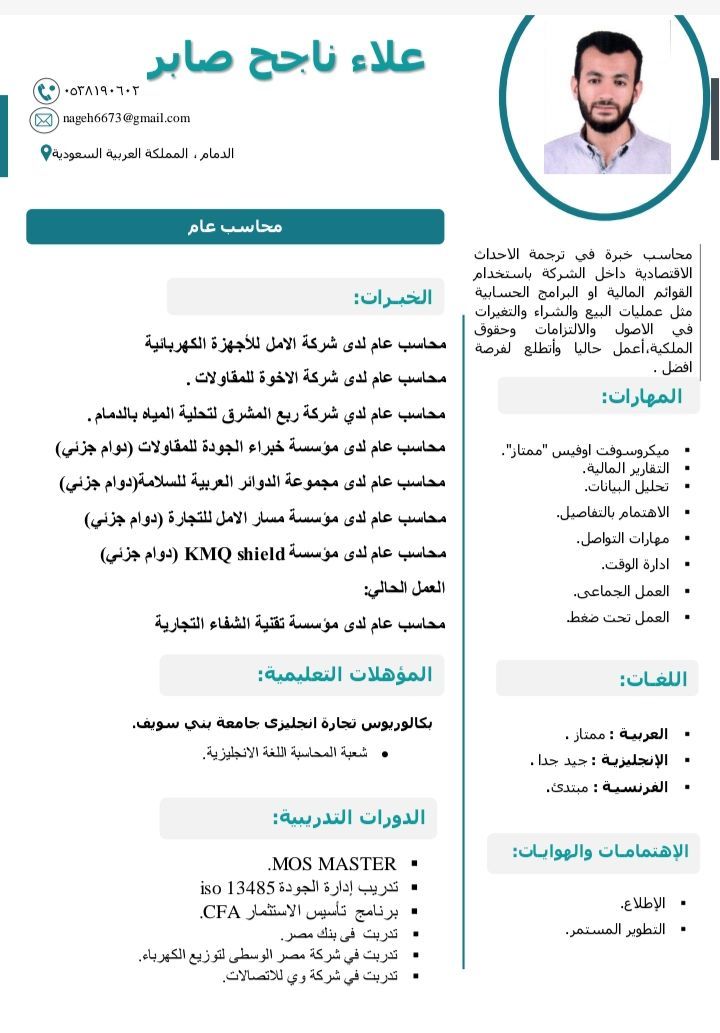 محاسب مصري خبرة حاصل على بكالوريوس تجارة قسم اللغة الانجليزية، خبرة في ترجمة الأحداث الاقتصادية داخل الشركة مثل عمليات البيع والشراء والتغيرات في الأصول والالتزامات وحقوق الملكية باستخدام كافة البرامج الحسابية، خبرة في اعداد ورفع اقرارات ضريبة القيمة المضافة عملت في مؤسسات كثيرة وأتطلع للعمل في شركة جيدة من اجل العمل بروح الفريق والاستفادة من خبراتي العملية وتنميتها في بيئة منظمة