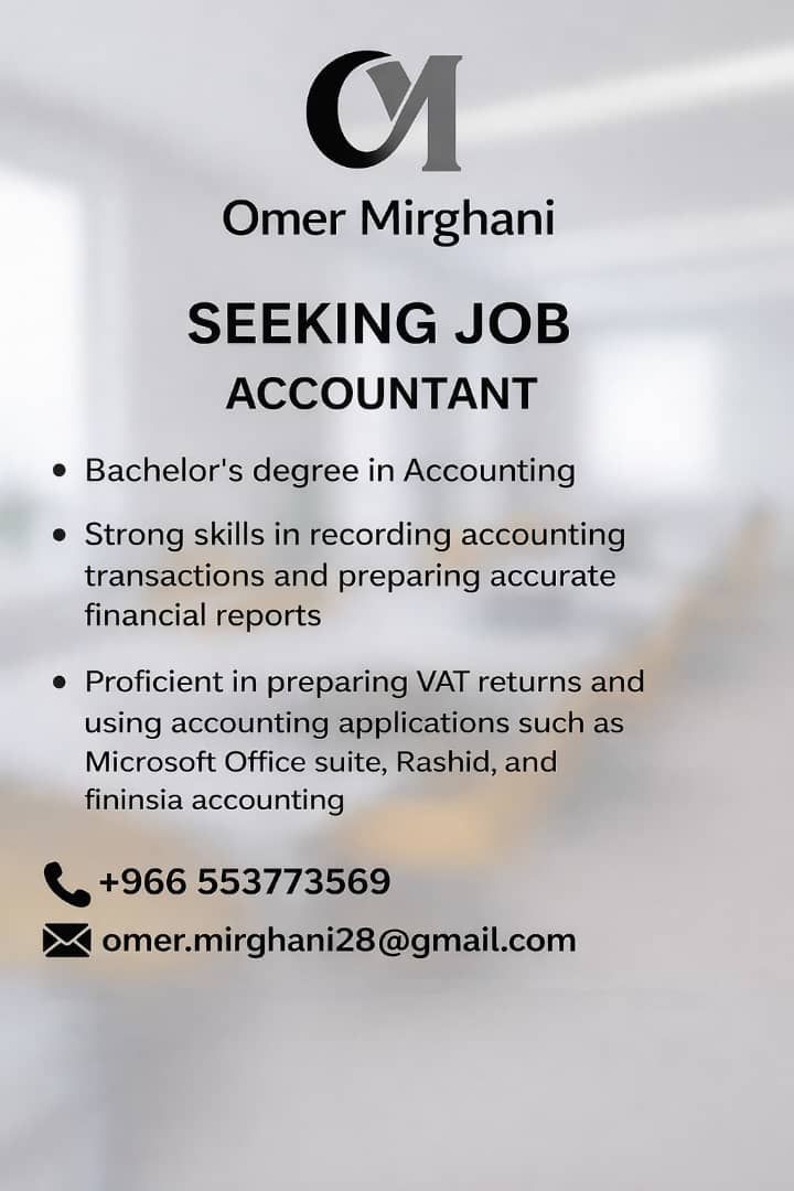 محاسب سوداني بخبرة أكثر من 12 سنة داخل المملكة العربية السعودية، عملت في عدة مجالات منها المقاولات (الصيانة وعزل الأسطح) الاستيراد والتصدير والرخام في الرياض والدمام وخميس مشيط والقصيم أجيد تسجيل ومعالجة العمليات المحاسبية، اعداد التقارير المالية وتحضير اقرارات ضريبة القيمة المضافة. لدي خبرة قوية في Microsoft Office Word, Excel, PowerPoint وبرامج الرشيد، فينيسيا، وسماك. جاهز للانضمام فورا