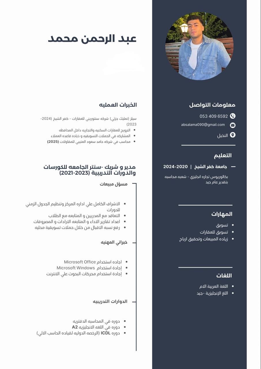 محاسب مصري خريج تجارة انجلش دفعة 2024 اشتغلت في السعودية في شركة مقاولات وعندي خبرة جيده في مجال المبيعات العقاري والسيارات وموجود رخصة قيادة سعوديه
