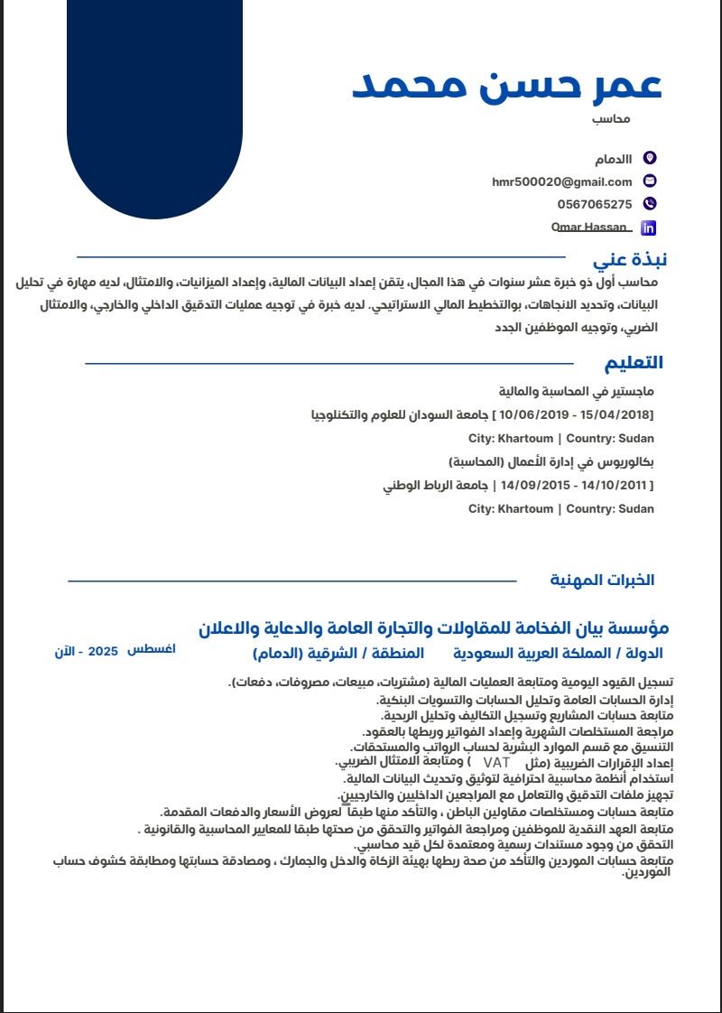 محاسب أول ذو خبرة عشر سنوات في هذا المجال، يتقن اعداد البيانات المالية، واعداد الميزانيات، والامتثال، لديه مهارة في تحليل البيانات، وتحديد الا نجاة أت، بوالتخطيط المالي الاستراتيحي. لديه خبرة في توجيه عمليات التدقيق الداخلي والخارجي، والامتثال الضربي، وتوجيه الموظفين الجدد وخبرة في التدريس أون لاين للمواد الادارية والمحاسبية