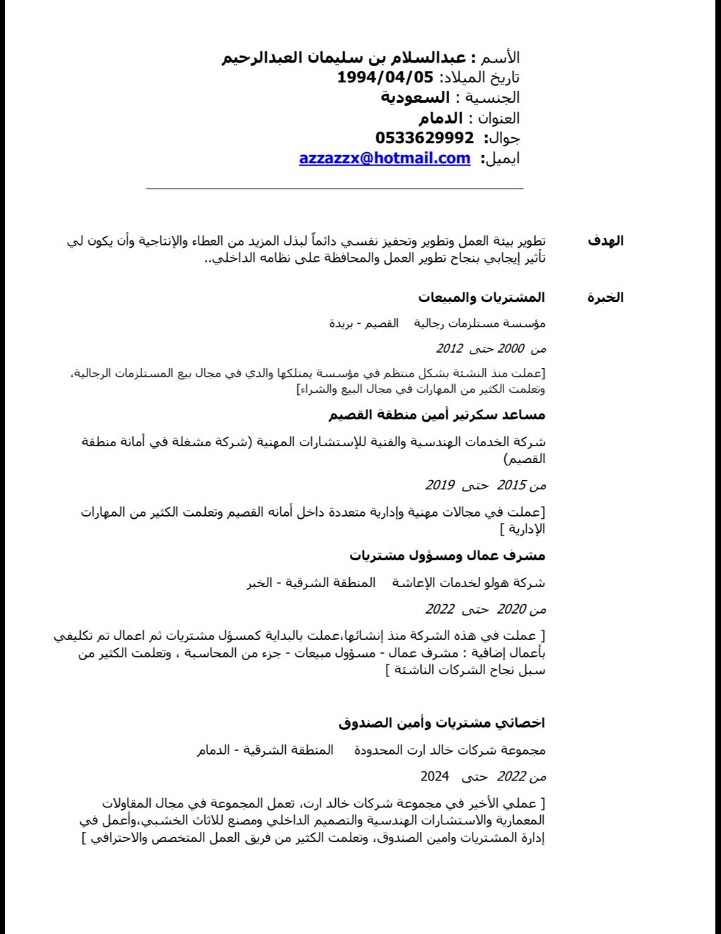 سعودي ابحث عن فرصة عمل لدي خبرة متعددة في عدة مجالات أبرزها مجال المشتريات والمبيعات والادارة والاشراف والحسابات، ولدي خبرة وقدرة على تخفيض التكاليف / العنوان حاليا الدمام الخبر ولا مانع للانتقال الى مدينة أخرى / مسؤول مدير مشتريات مشرف تشغيل محاسب