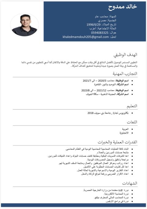 الاسم أحمد سمير السيد الدمام، المنطقة الشرقية - المملكة العربية السعودية الجنسية مصري التعليم. بكالوريوس تجارة 2019 جامعة الزقازيق التقدير جيد جدا قسم المحاسبة الخبرات والمهارات اعداد وتسجيل القيود اليومية، بما في ذلك التسويات والمستحقات والمصروفات المقدمة. ضمان دقة ونزاهة حسابات دفتر الستاذ العام وغيرها